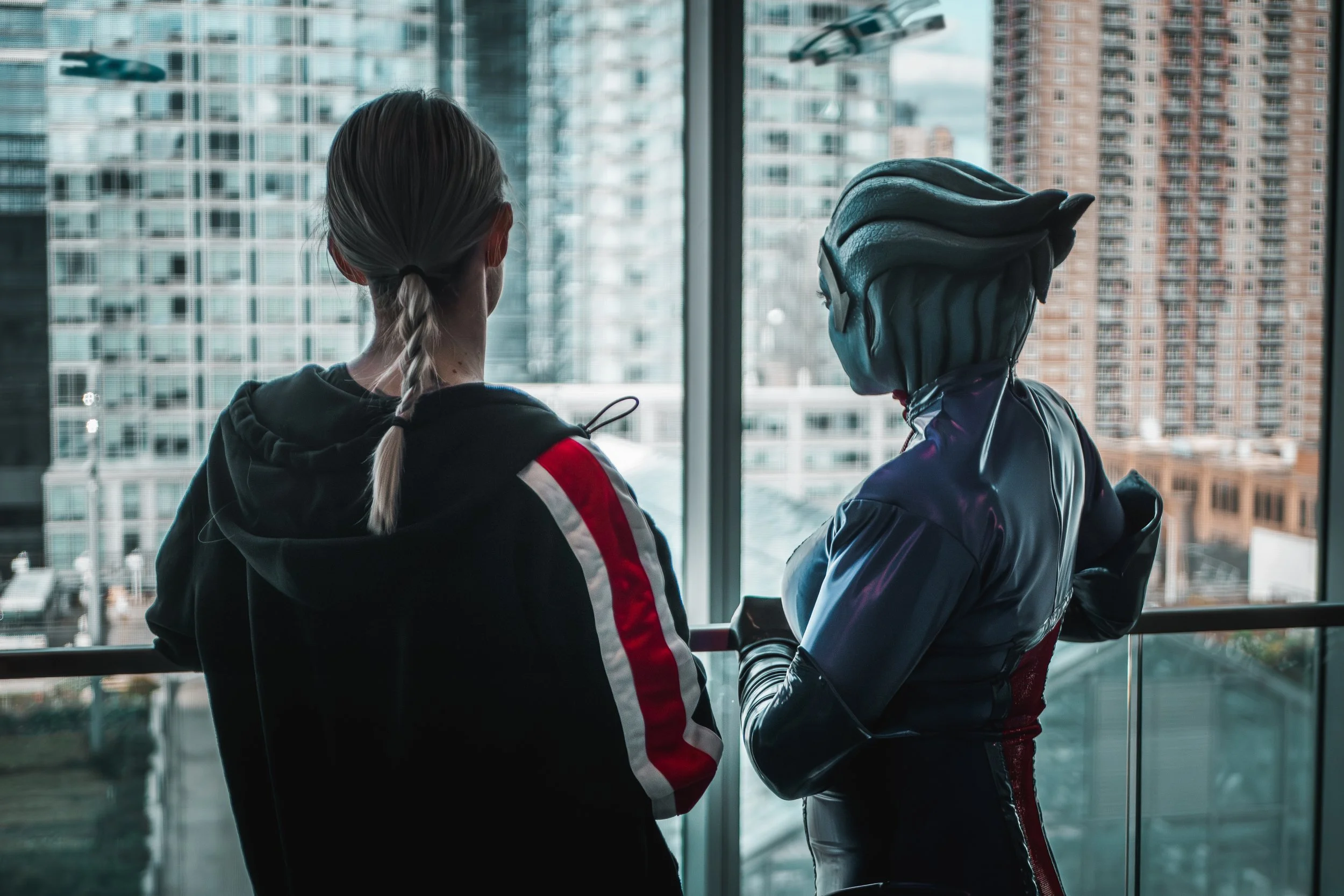 Many of my fellow Mass Effect cosplayer friends have made "formal” versions of their costumes, including Amelia (@makermage) who made Femshep’s N7 dress from ME3. I have always liked the purple dress Liara wears to Shepard’s cabin at the end of the Lair of the Shadow Broker DLC, so I decided to make it for PAX East 2024! Amelia and I got the chance to get together for a little Citadel shore leave photoshoot at the con. I also took the opportunity to pick up a space hamster from the Sanshee booth, so I just had to include him in the shoot!